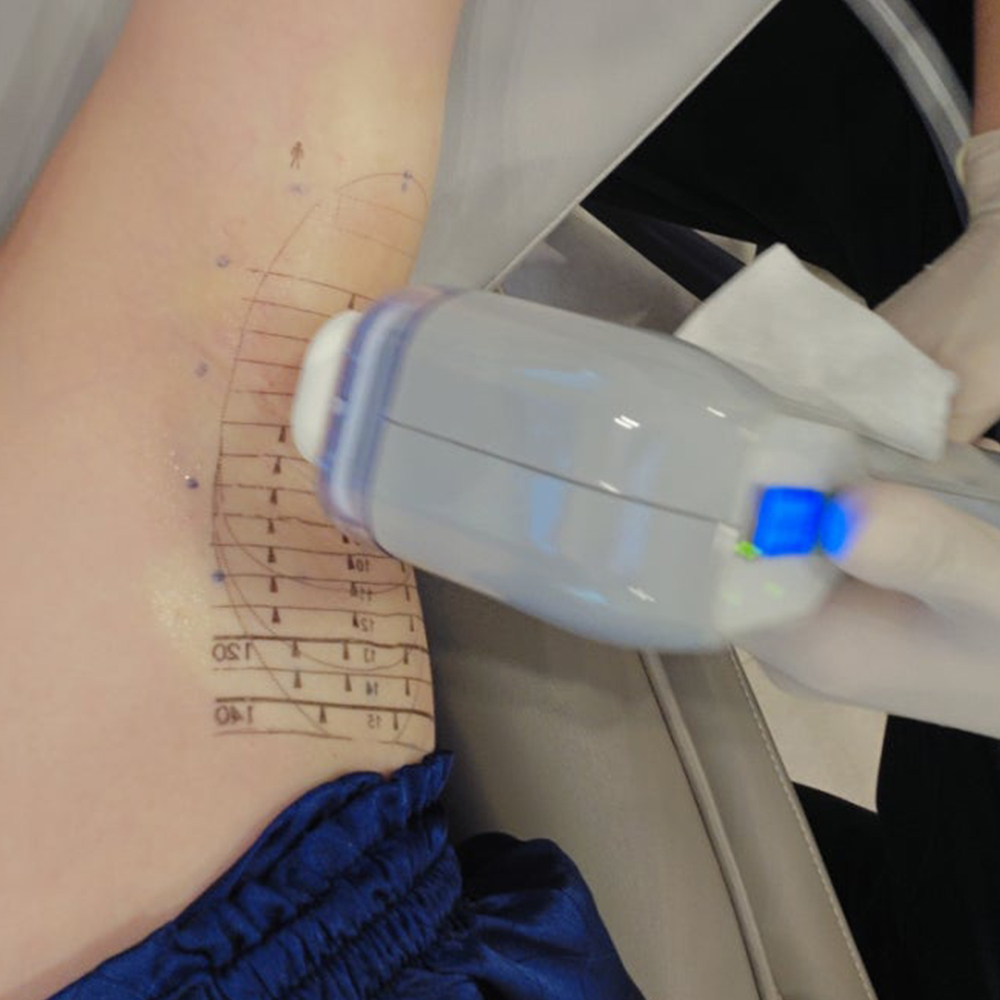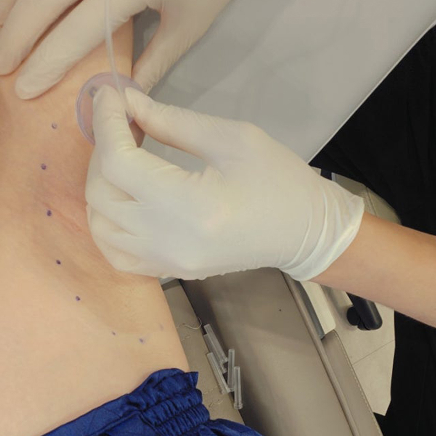 마킹한 부분에 핸드피스를 밀착시킨 후 마이크로웨이브를 정교하게 전달하여 겨드랑이의 땀샘, 모근 등을 파괴하는 시술을 진행합니다. (겨드랑이는 굴곡이 있는 부위라, 핸드피스와 피부가 제대로 밀착된 상태에서 에너지를 효율적으로 전달하는 것이 중요합니다.)
