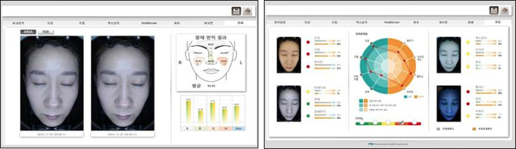 피부 진단기를 활용하면 일반광, 광택광, 편광, 자외선광 4개의 빛으로 피부를 체크하여 눈으로는 보기 어려운 미세한 모공, 피부톤, 피부결, 색소, 홍조, 피지 분포, 여드름균 등을 확인할 수 있거든요.